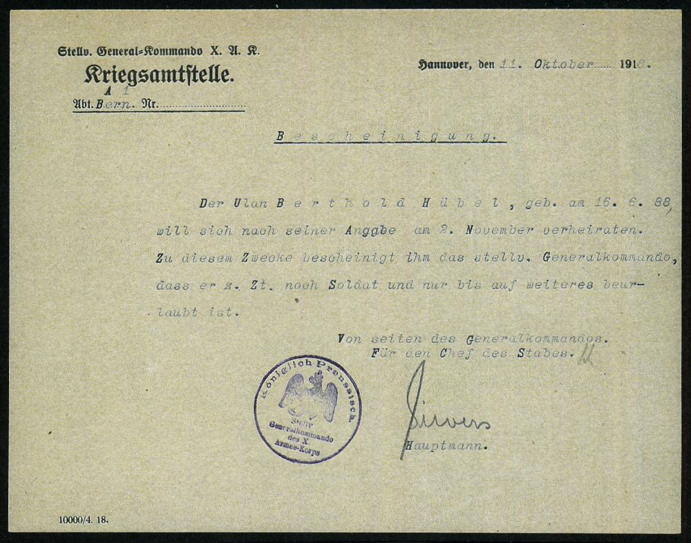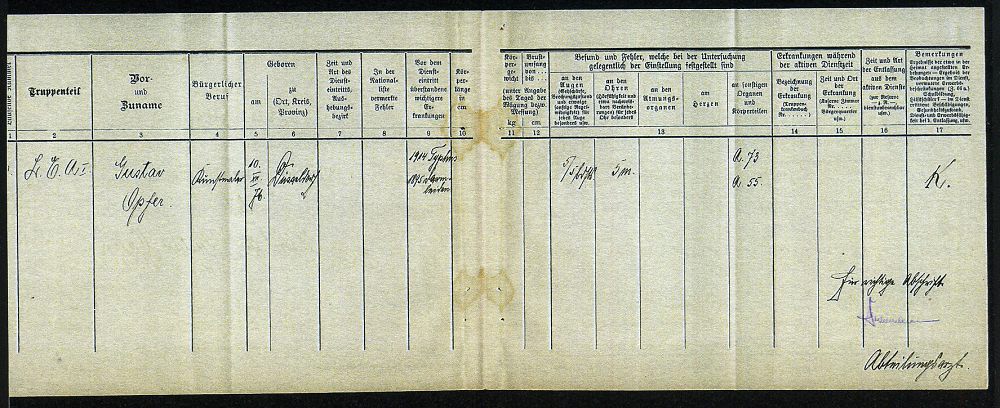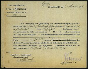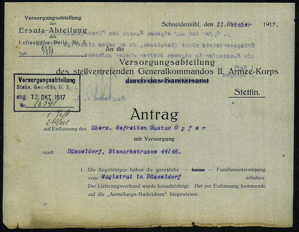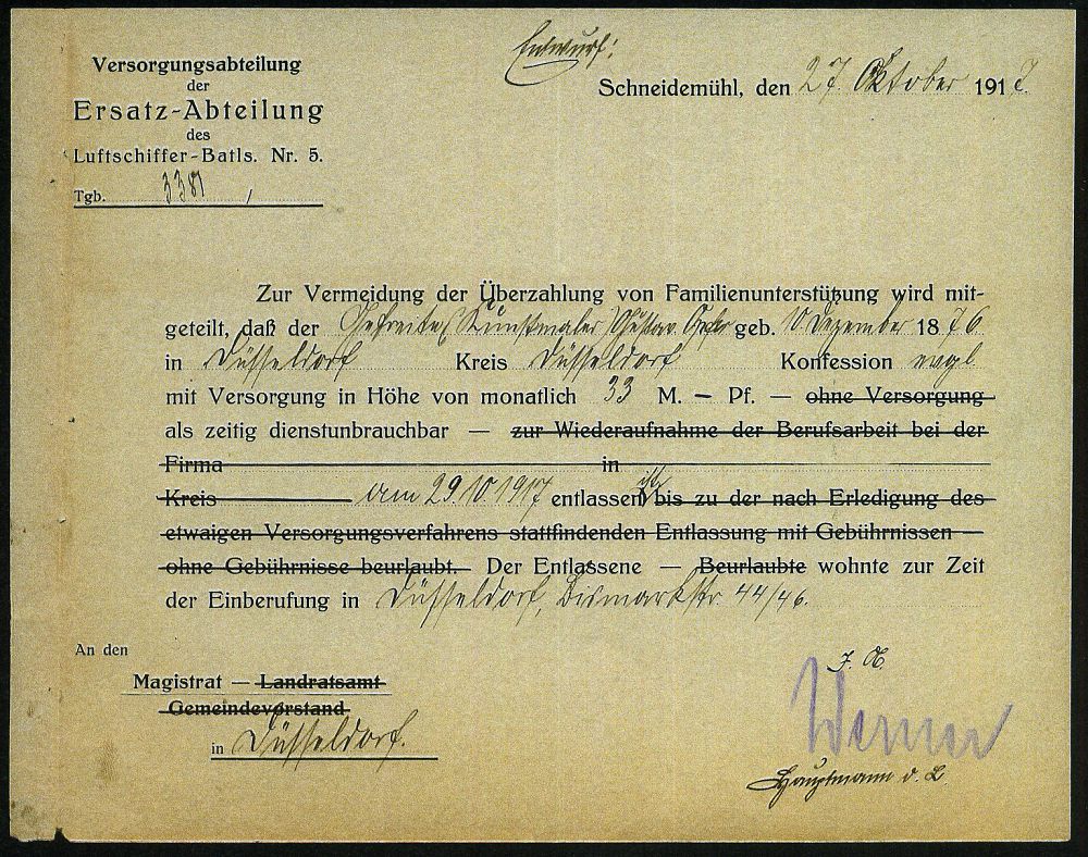 | 576 | 60 € | I. WELTKRIEG: LUFTSCHIFFE & LUFTSCHIFFER-EINHEITEN : Schneidemühl / Stettin 1917 Dokumentation: Versorgungs-Ersatz-Abteilung Luftschiffer-Batl. Nr.5 über die Krankenlage u. Entlassung eines Luftschiffers (Typhus etc.) insges. 5 Dokumente: Kriegsstammrollen-Auszug, Auszug Mannschafts-Untersuchungsliste, Versogungsanträge (Format etw. größer als DIN A 5) mit genauen Befunden, 5 interessante Belege! | | |