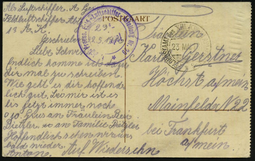 | 579 | 25 € | I. WELTKRIEG: LUFTSCHIFFE & LUFTSCHIFFER-EINHEITEN : DEUTSCHES REICH 1916 (23.5.) 2K-Gitter: FELDPOSTAMT des XIII. (K. Württ.) ARMEEKORPS (Nr.225) + viol. 3K-HdN: Königl. Feld-Luftschiffer-Abteilung Nr. 29/* + hs. Abs.: ".. Feldluftschiffer Abtg. N. 29/ 13. A. K.", s/w.-Feldpost-Ak. (Kirche) Ortsname aus Tarngründen herausgekratzt! n. Mainfeld | | |