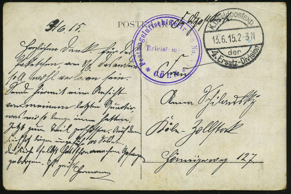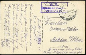 | 582 | 28 € | I. WELTKRIEG: LUFTSCHIFFE & LUFTSCHIFFER-EINHEITEN : DT.BES.BELGIEN 1915 (13.6.) 1K-SBrücke: K. D. Feldpostexp./der/4. Ersatz-Division (Nr.1335) + viol. 2K-HdN: Festungs-luftschiffertrupp No. 10/* CÖLN * , s/w.-Feldpost-Ak.: ZARREN Plaats n. Köln | | |