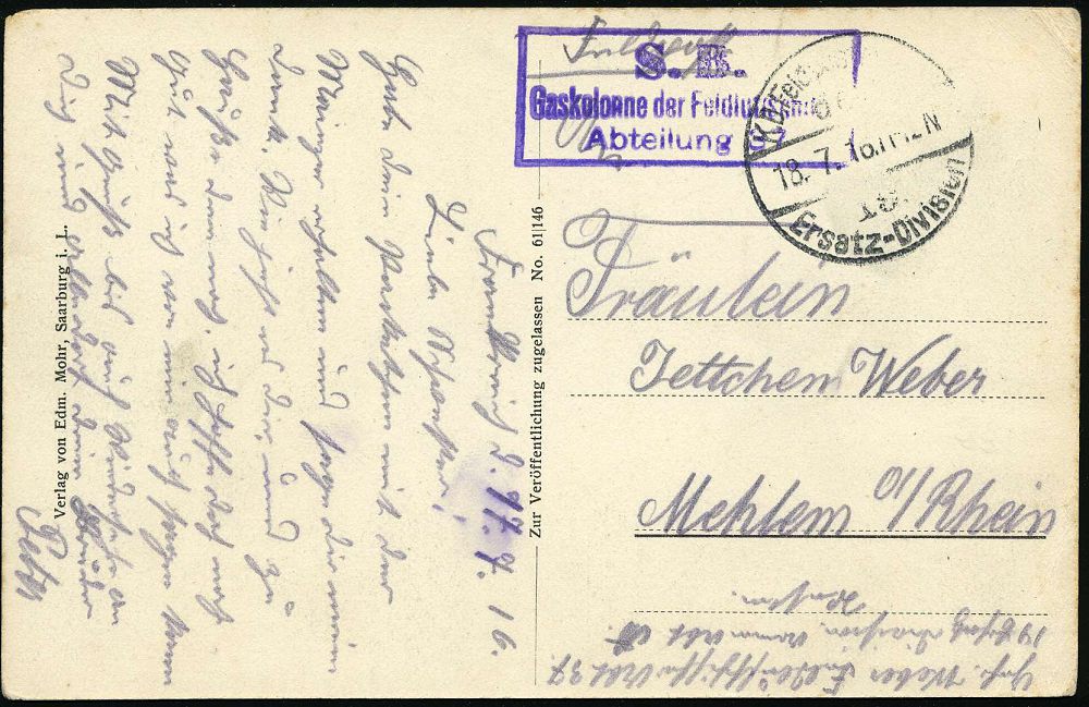| 581 | 35 € | I. WELTKRIEG: LUFTSCHIFFE & LUFTSCHIFFER-EINHEITEN : DEUTSCHES REICH 1916 (18.7.) 1K-Brücke: K.D. Feldpostexp./der/19.Ersatz-Division (Nr.1353, oben undeutl.) + klarer viol. Ra.3: .. G a s k o l o n n e der Feldluftschiff-/ Abt.37 = Gas für Kriegs-Zeppeline! etc., s/w.-Feldpost-Ak. (Militär-Platz-Konzert in Cirey) n. Mehlem, seltene Einheit! | | |