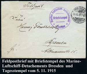 | 574 | 50 € | I. WELTKRIEG: LUFTSCHIFFE & LUFTSCHIFFER-EINHEITEN : DRESDEN-/ *NEUST.25/ e 1915 (5.11.) 1K-Gitter + viol. 1K-Hdn: Marine - L u f t s c h i f f - Detachement/Dresden (Bf. rs. Klappen-Mäng.) klar gest., seltener Feldpost-Bf. n. Bremen | | |