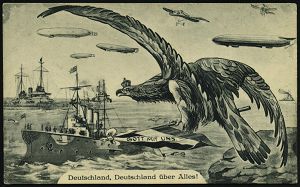 | 580 | 18 € | I. WELTKRIEG: LUFTSCHIFFE & LUFTSCHIFFER-EINHEITEN : DEUTSCHES REICH 1916 (27.5.) 1K-Brücke: K. D. Feldpoststation/Nr 121 (Nr.1919 I) + viol. 3K-HdN: Bayer. Fuß-Artillerie-Batterie 398/*** , klar gest. s/w.-Propaganda-Ak.: Deutschland, Deutschland über Alles! = 4 Zeppeline u. Flugzeuge über Kriegsschiffen, Adler mit Flagge etc., klar gest. Feldpost-Kt. n. Gmund | | |