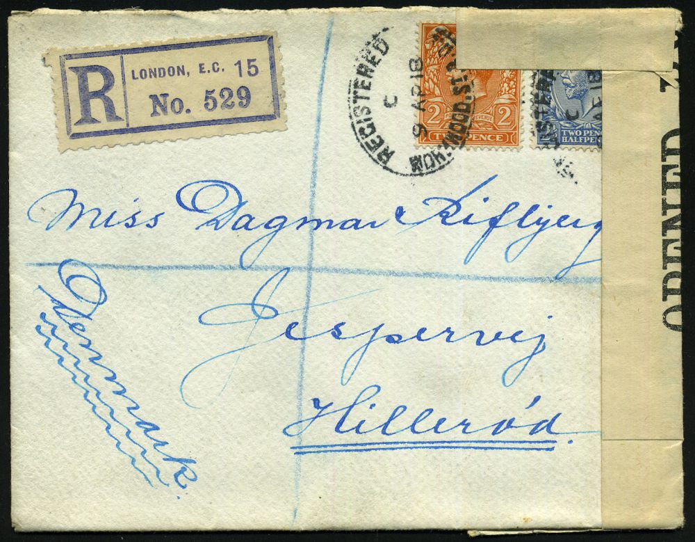 | 885 | 18 € | I. WELTKRIEG: ZENSURPOST 1914-18 : GROSSBRITANNIEN 1918 (9.4.) Oval-Einschreiben-St: REGISTERD/C/WORNWOOD ST.E.C. + blauer RZ: LONDON, E.C. + brit. Zensur-Verschluß-Zettel: OPENED BY/CENSOR/4274 (Wo.5), Ausl.-Zensur-R-Bf. n. Dänemk. (AS: Hilleröd) | | |