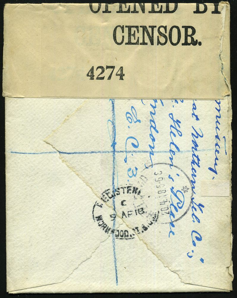 | 883 | 18 € | I. WELTKRIEG: ZENSURPOST 1914-18 : GROSSBRITANNIEN 1914 (17.12.) Oval-St: REGISTERED/LONDON CHIEF OFFICE E.C. + blauer RZ: LONDON, E.C. + brit. Zensur-Verschlußzettel: OPENED BY/CENSOR/283 (Wo.5) + rs. Lacksiegel, dekorativer Ausl.-Zensur-R-Bf. (n. ST.GALLEN 1, rs.AS) | | |