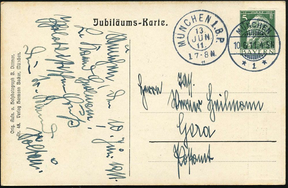 | 30 | 20 € | DEUTSCHE GESCHICHTE 1871 - 1914 : MÜNCHEN 1. B.P./ 11 1911 (10.6.) bayer. 2K auf PP 5 Pf. Luitpold, grün: "25. Regierungs-Jubil.- Prinzregent Luitpold" (in Uniform mit Orden) Bedarf n. Gera (Frech.PP 27/C 32-01) | | |