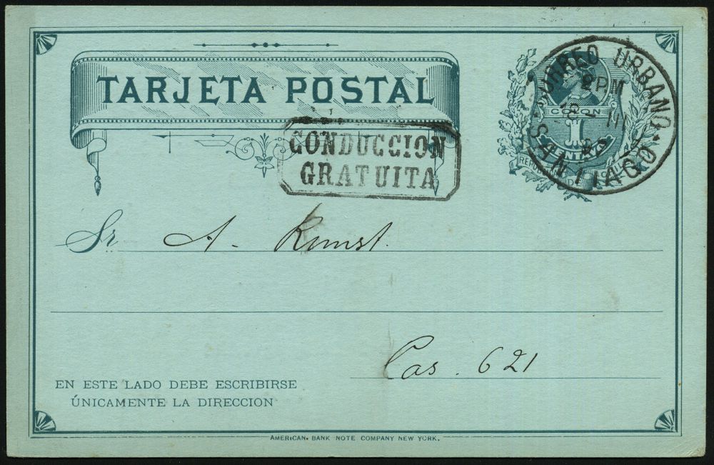 | 63 | 18 € | DEUTSCHE GESCHICHTE 1871 - 1914 : CHILE 1897 (18.3.) amtl. Inl.-P 1 C. Columbus, grün + rs. Zudruck: Deutscher Gesangsverein "Frohsinn" Gedächtnisfeier, 100 JÄHR. GEBURTSTAG, S.M. Kaiser Wilhelm 1 (verbunden mit Tanz) 1K: CORREO URBANO/SANTIAGO + Ra.2: CONDUCCION/ GRATUITA, Ortskt. | | |