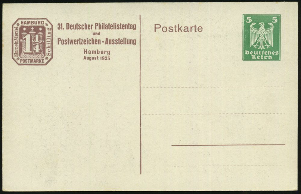 | 23 | 20 € | DEUTSCHE GESCHICHTE 1871 - 1914 : Hamburg 1925 (Aug.) PP 5 Pf. Adler, grün: 31. Deutscher Philatelistentag = Bismarck-Denkmal , ungebr. (Mi.PP 81/C 8-09) | | |