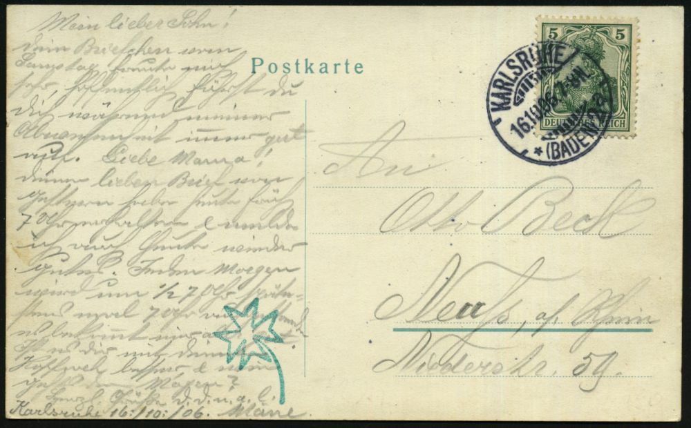 | 25 | 16 € | DEUTSCHE GESCHICHTE 1871 - 1914 : KARLSRUHE/ *(BADEN)2/ a 1906 (16.10.) 1K-Gitter auf s/w.-Jubil.-Ak.: Goldene Hochzeit Großherzog Friedrich.. Luise von Baden (6 Portraits, Schloß, Wappen), seltene Bedarfs-Kt.! (Mi.85 I) | | |