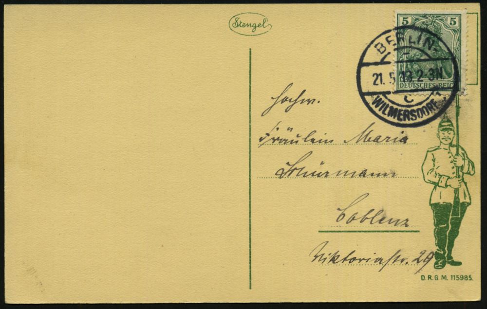 | 12 | 12 € | DEUTSCHE GESCHICHTE 1871 - 1914 : BERLIN-/ c/ WILMERSDORF 1 1913 (21.5.) 1K-Brücke auf EF 5 Pf. Germania auf Zier-Ak.: Germania-Frankatur als MilItär-Standarte (Soldat) rs. Ansicht: Kriegsakademie ! (Leitung 1906-1914: H. Joh. L. von Moltke) klar gest. Fernkt. (Mi.85 I) | | |