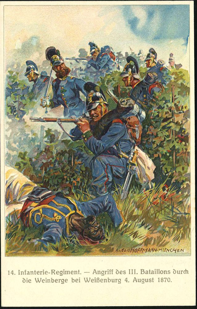 | 33 | 25 € | DEUTSCHE GESCHICHTE 1871 - 1914 : Nürnberg 1914 (Juli) PP 5 Pf. Huppwappen, grün: 100-Jahrfeier 14. Inf. Regt.Hartmann (Nürnberg): Angriff des III. Bataillons durch die Weinberge bei Weißenburg 4.8.1870 (sign. Anton HOFFMANN) ungebr. (Frech.PP 38/C 16-06) | | |