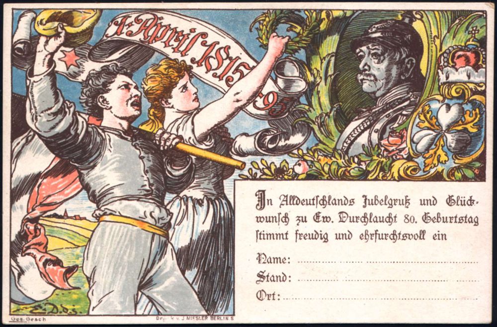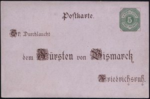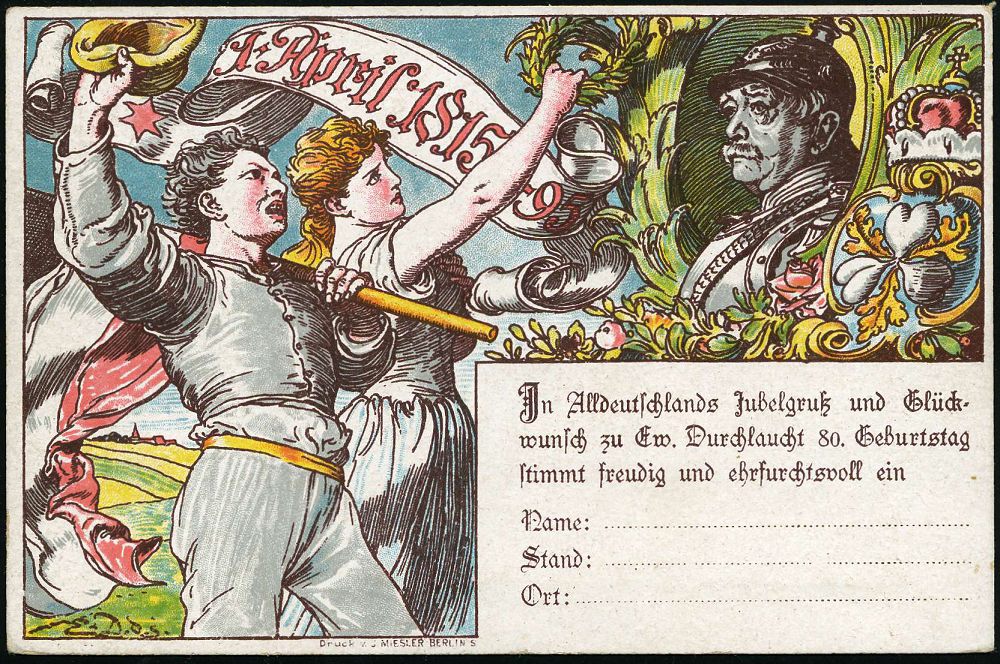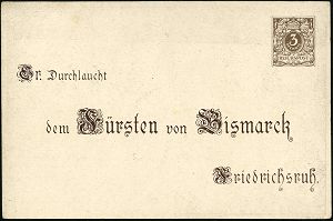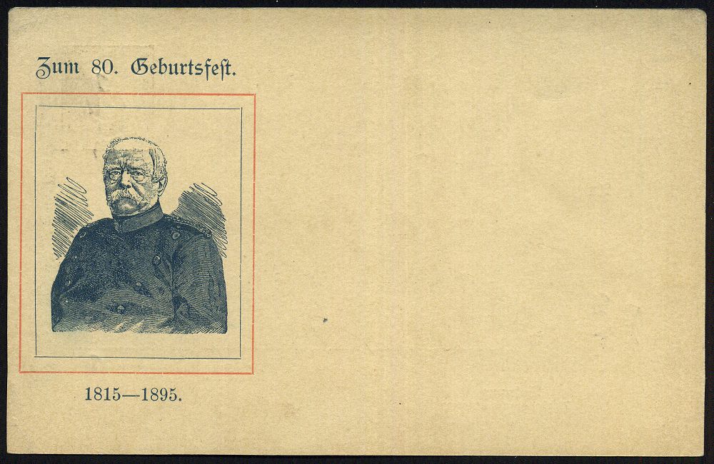 | 44 | 18 € | DEUTSCHE GESCHICHTE 1871 - 1914 : DEUTSCHES REICH 1895 PP 3 Pf. Ziffer Krone, braun: IN TRINITATE ROBUR.. dem Fürsten Bismarck = 80.Geburtstag (ohne Golddruck u.Arabesken) Abb: Bismarck mit Pickelhaube, Rosen, Krone, Jubelpaar m.Flagge etc., ungebr. (Mi.PP 8/C1-03) | | |