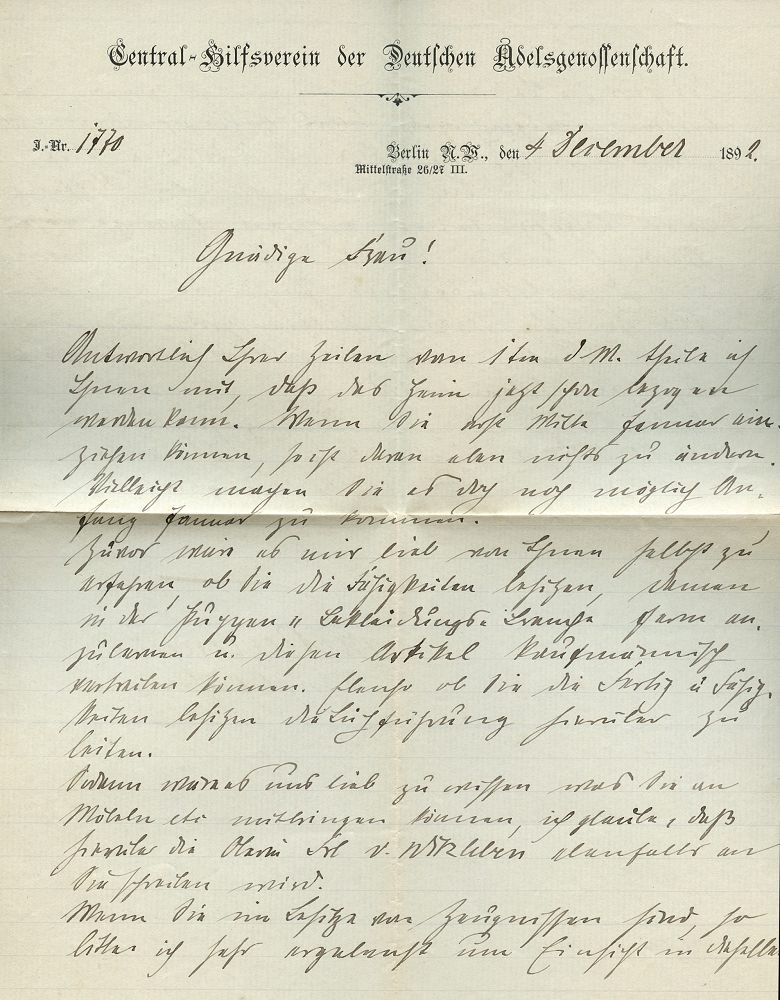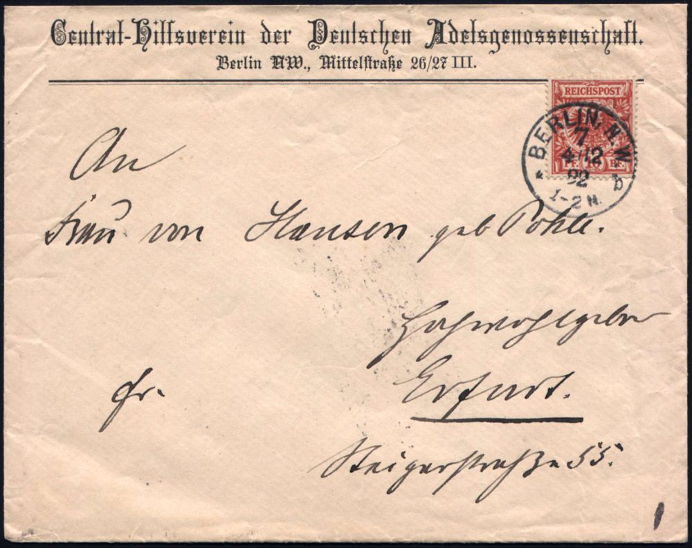 | 4 | 25 € | DEUTSCHE GESCHICHTE 1871 - 1914 : BERLIN,N.W./ 7/ *b 1892 (4.12.) 1K auf Vordruck-Bf.: Central-Hilfsverein des Deutschen Adelsgenossenschaft (Zierschrift!) + Inhalt: Briefbogen mit gleicher Zierschrift , klar gest.!, 2 Belege kompl.! (Mi.47 EF) | | |
