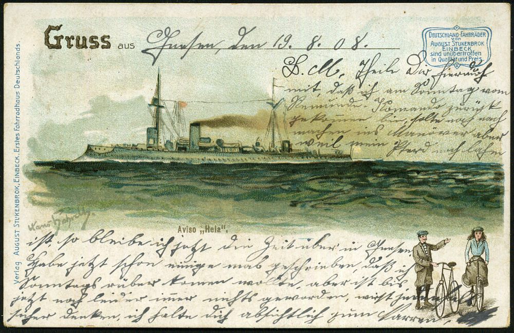 | 19 | 15 € | DEUTSCHE GESCHICHTE 1871 - 1914 : Einbeck 1908 (19.8.) Color-Litho-Reklame-Ak.: DEUTSCHLAND-FAHRRÄDER/VON/AUGUST STUKENBROK.. = Aviso "Hela" (u. 2 Radfahrer, rs. Fahrradkorso) Frankatur abgelöst, gebr. | | |