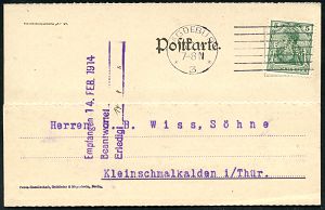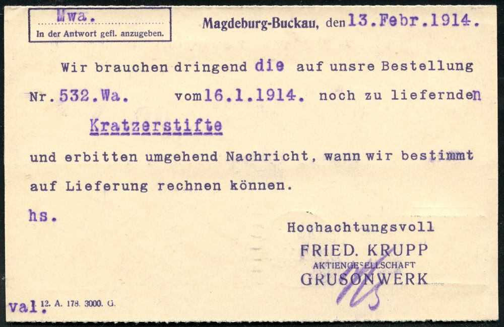 | 28 | 16 € | DEUTSCHE GESCHICHTE 1871 - 1914 : Magdeburg 3 1914 (13.2.) EF 5 Pf. Germania mit Firmenlochung: "F K G" = F riedrich Krupp-Gruson auf Firmenkt. kurz vor dem I. Weltkrieg!, rs. viol. Abs.-3L, Krupp & Gruson = Technik- u.Waffen-Pioniere! (Mi.85 I Perfin) | | |