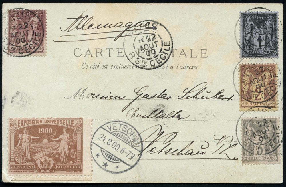 | 65 | 20 € | DEUTSCHE GESCHICHTE 1871 - 1914 : FRANKREICH / DEUTSCHES REICH 1900 (22.8.) 2K: PARIS/ RSte CECILIE 4x + offiz., braune Vignette.: Expos. Universelle 1900 = Austragungsort Olympische Spiele ! , s/w.-Foto-Ak.: EXPO. 1900, deutscher u. spanischer Pavillon (schwach fleckig), Ausl.-Kt. n. Vetschau, vs. AS. | | |