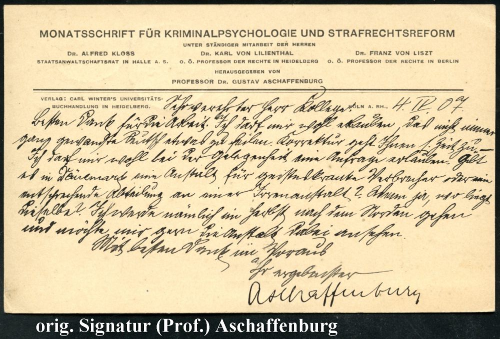 | 26 | 18 € | DEUTSCHE GESCHICHTE 1871 - 1914 : Köln 1907 (4.4.) 1K-Gitter: CÖLN/*1g auf Vordruck-Kt.: MONATSSCHRIFT FÜR KRIMINALPSYCHOLOGIE U. STRAFRECHTSREFORM.. , Ausl.-Karte n. Viborg , vs. AS., orig, Signatur (Prof.) "Aschaffenburg" (Mi.86 I EF) | | |