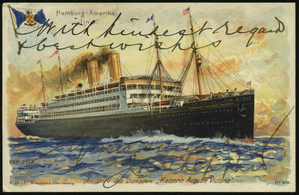 | 55 | 35 € | DEUTSCHE GESCHICHTE 1871 - 1914 : DEUTSCHES REICH 1906 (26.10.) 1K-BPA: DEUTSCH-AMERIK. SEEPOST/HAMBURG-/NEW-YORK/a = Dampfer "Kaiserin Augusta Victoria" , klar gest. EF 10 Pf. Germania, Color-Litho-HAPAG-Ak.: An Bord des Dampfers "Kaiserin Augusta Victoria" n. Berlin | | |