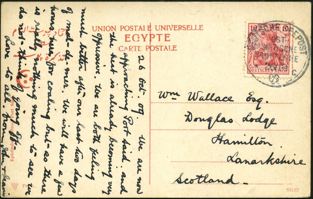 | 56 | 28 € | DEUTSCHE GESCHICHTE 1871 - 1914 : DEUTSCHES REICH 1909 (26.10.) 1K-BPA: DEUTSCHE SEEPOST/OST-/ASIATISCHE/HAUPTLINIE/*c = Dampfer "Prinz Ludwig" klar auf EF 10 Pf. Germania (Mi.86 I) Color-Foto-Ak: Cairo, Village arabe n. Schottland, (1919 Reparation an Großbrit.) | | |