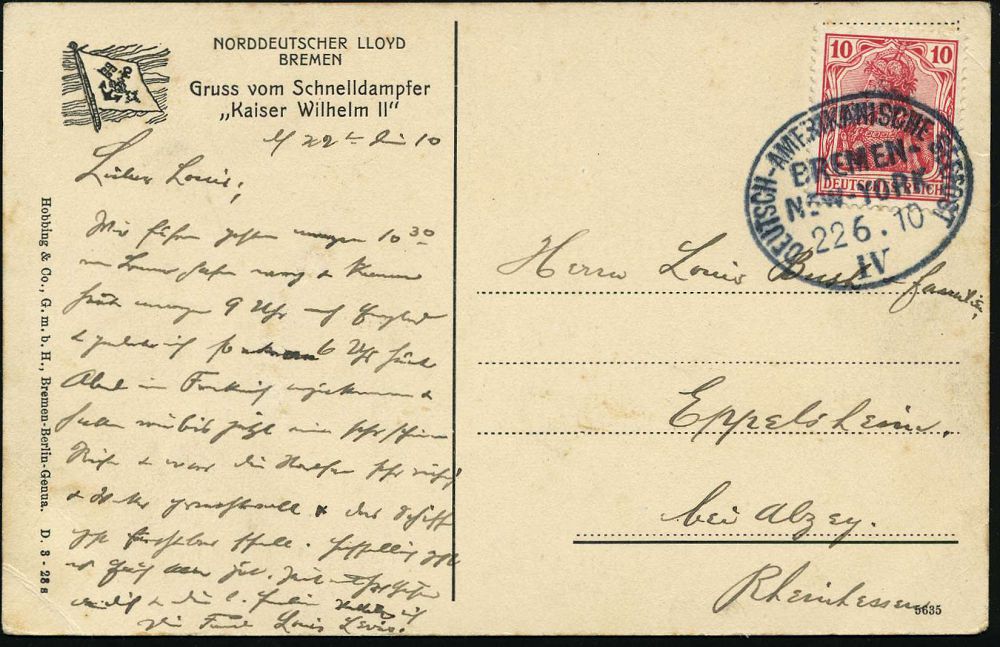 | 57 | 30 € | DEUTSCHE GESCHICHTE 1871 - 1914 : DEUTSCHES REICH 1910 (22.6.) Oval-BPA: DEUTSCH-AMERIKANISCHE SEEPOST/ BREMEN-/ NEW YORK/IV. sehr klar auf EF 10 Pf. Germania (Mi.86 EF) s/w.-Reederei-Ak.: Gruss v. Schnelldampfer "Kaiser Wilhelm II", Wiener Café für Raucher (kl. Eck-Bugspur) n. Eppelsheim | | |