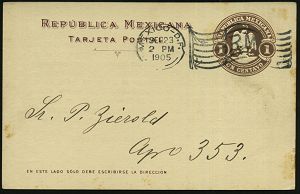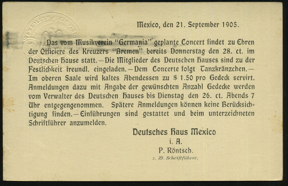 | 67 | 20 € | DEUTSCHE GESCHICHTE 1871 - 1914 : MEXICO / DEUTSCHES REICH 1905 (21.9.) amtl. P 1 C. braun "Staatswappen Mexico" + Zudruck: Auslands-Besuch Kreuzer "Bremen", Einladung für Konzert (Musikverein "Germania") Flaggen-MaSt.: MEXICO-D.F./R.M. (Bickerdike) Ortskt. | | |