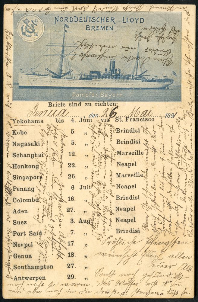 | 47 | 35 € | DEUTSCHE GESCHICHTE 1871 - 1914 : DEUTSCHES REICH 1899 (26.7.) 1K-BPA: DEUTSCHE SEEPOST/OST-/ASIATISCHE/HAUPTLINIE/* c = Reichspostdampfer "Preussen" , klar gest. zweifarbige Schiff-Ak. aus Neapel n. Dresden, vs. AS. | | |