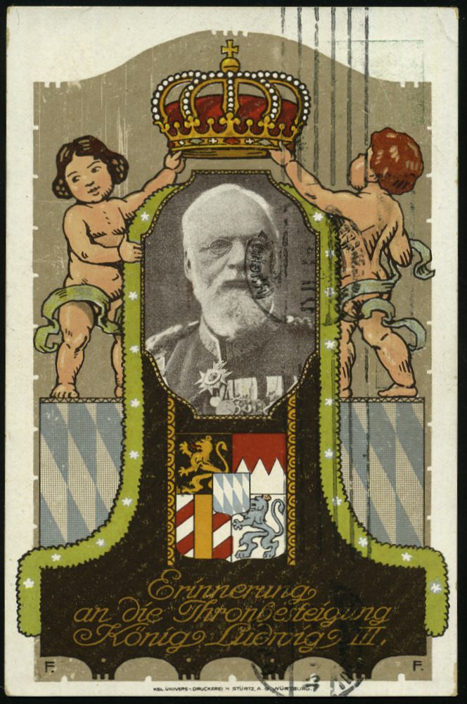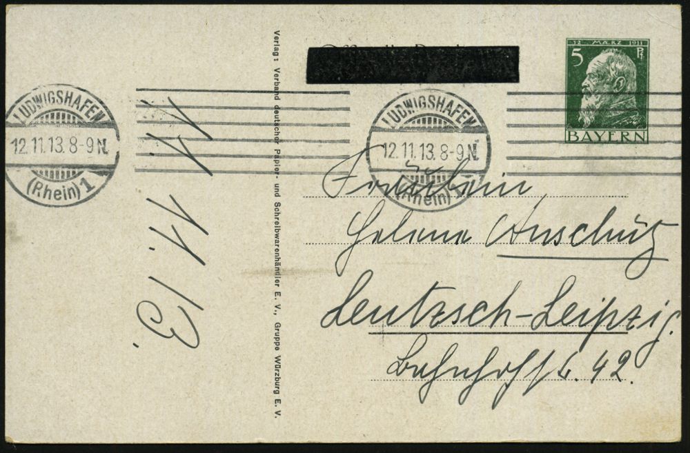| 27 | 20 € | DEUTSCHE GESCHICHTE 1871 - 1914 : LUDWIGSHAFEN/ (Rhein)1 1913 (12.11.) Band-MaSt. auf PP 5 Pf. Luitpold, grün: Jubil. Thronbesteigung König Ludwig III. (in Uniform, Orden, Putten m. Krone, Wappen) Bedarf!, rs. Buchdruck-Schwärzung "Postkarte" (Frech.PP 27/D 2) | | |