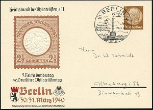 | 13 | 18 € | DEUTSCHE GESCHICHTE 1871 - 1914 : BERLIN/ Nationale/ Briefmarken-/ Ausstellung/ g 1940 (30.3.) SSt mit UB "a" = Siegessäule deutsch-französ. Krieges 1870/71 auf PP 3 Pf. Hindenbg.: 46. Deutscher Philatel.Tag (Brustschildmarke 2 1/2 Gr.) = 1. Marke Deutschen Reich! (Mi.PP 122/C 104-04) Inl.Karte (Bo.322 a) | | |