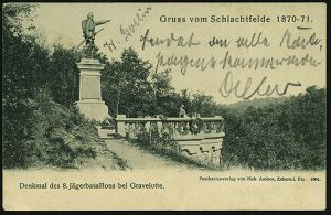 | 22 | 15 € | DEUTSCHE GESCHICHTE 1871 - 1914 : GRAVELOTTE/ ** 1901 (15.8.) 1K auf s/w.-Foto-Ak.: Gruss vom Schlachtfelde 1870-71 = Denkmal 8. Jäger-Btl. , portofreie Soldatenkt. an Fuß-Artl.-Rgt. No.10 in Straßburg | | |