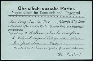 | 15 | 18 € | DEUTSCHE GESCHICHTE 1871 - 1914 : DARMSTADT/ *2b 1901 (14.11.) 1K-Gitter auf amtl. Orts-P. 2 Pf. Germania + rs. Zudruck: Christlich-soziale Partei.. Darmstadt (Einladung zur Versammlung) Bedarf | | |