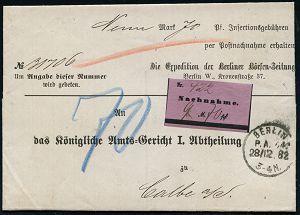 | 2 | 18 € | DEUTSCHE GESCHICHTE 1871 - 1914 : BERLIN/ P.A.40 1882 (28.12.) 1K auf NN-Firmen-Bf: Berliner Börsen-Zeitung m i t Inhalkt: Insertions-Rechnung , früher lila NN-Zettel ("70 Pf.") n. Calbe, rs. AS. (BHW.633, + 40.-DM) | | |