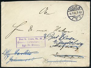 | 11 | 25 € | DEUTSCHE GESCHICHTE 1871 - 1914 : BERLIN,W./ *9a 1906 (14.9.) 1K-Gitter + viol. Ra3: Frei lt. Avers No. 21./General-Verwaltung/Kgl. Pr. Museen = Verwaltung der Museumsinsel mit Pergamon- u. "Neuem Museum" etc. , rs. blaue Siegeloblate: GENERAL-VERWALTUNG DER K. MUSEEN, MUSEUM FÜR VÖLKERKUNDE, nachgesandter Fern-Bf., rs. 3 verschiedene TS./AS. | | |