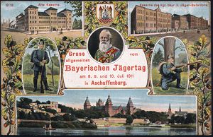 | 1 | 16 € | DEUTSCHE GESCHICHTE 1871 - 1914 : ASCHAFFENBURG 2 1911 (9.7.) 1K auf Color-Jubil.-Ak.: "Gruss v. allgem. Bayer. Jägertag/am 8. 9. u.10 Juli 1911" (Schloß, 2 Kasernen, 2 Jäger in Uniform etc.) Bedarf (Mi.77 EF) | | |