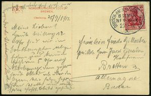 | 58 | 25 € | DEUTSCHE GESCHICHTE 1871 - 1914 : DEUTSCHES REICH 1912 (25.9.) Oval-BPA: DEUTSCH-AMERIKANISCHE SEEPOST/ BREMEN-/ NEW-YORK/X klar auf EF 10 Pf. Germania , s/w.-Reederei-Foto-Ak.: Cherbourg n. Bretten (Mi.86 I) | | |