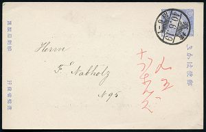 | 66 | 18 € | DEUTSCHE GESCHICHTE 1871 - 1914 : JAPAN / DEUTSCHES REICH 1907 (19.6.) amtl. P 10 Sen. "Kiku", blau + rs. deutscher Zudruck: Deutsche Evangelische Gemeinde, YOKOHAMA , Einladungs-Kt. zum Gottesdienst, Bedarf! | | |