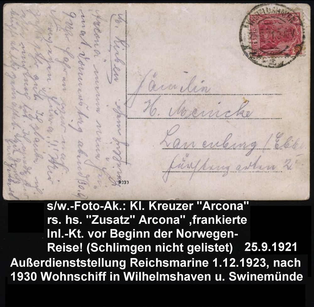 | 977 | 30 € | DEUTSCHE MARINE / DIENSTPOST 1919-1933 : WILHELMSHAVEN/ *1* 1921 (25.6.) 1K-Brücke auf EF 40 Pf. Germania + hs. "Arkona" = Kleiner Kreuzer , frankierte s/w.-Foto-Ak.: "Arkona" vor Beginn der Norwegenreise! (Schlimgen nicht gelistet!) Text: "Arcona meine neue Heimat, Donnerstag Abend (30.6.) 9 Uhr fahren wir nach Norwegen Hurra!!", sehr seltener Beleg n. Lauenburg/Elbe (Mi.145 EF) | | |