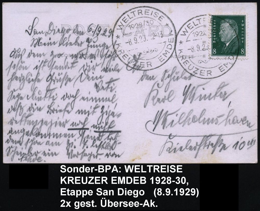 | 983 | 30 € | DEUTSCHE MARINE / DIENSTPOST 1919-1933 : DEUTSCHES REICH / U.S.A. 1929 (8.9.) 2K-Bord-PA, Sonderstempel: WELTREISE/*KREUZER EMDEN* = Leichter Kreuzer , 2x BPA auf Ef 8 Pf. Ebert, Auslandsreise U.S.A., Etappe San Diego, Übersee-Ak. (Zoo San Diego) n. Wilhelmshaven (Bo.1) | | |