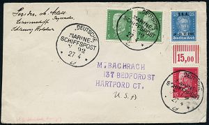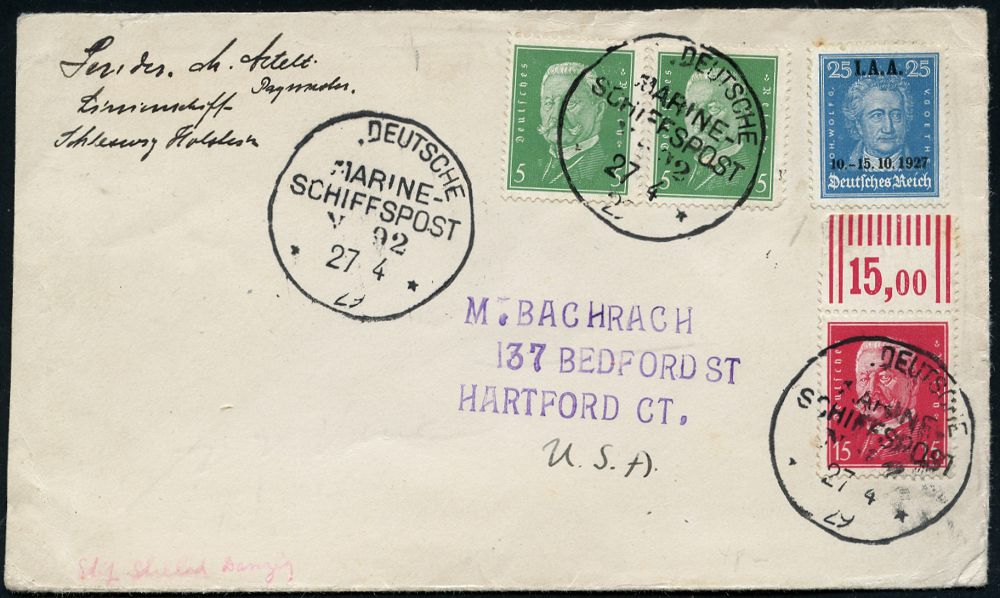 | 982 | 28 € | DEUTSCHE MARINE / DIENSTPOST 1919-1933 : DEUTSCHES REICH 1929 (27.4.) aptiertes 1K-Brücken-Bord-PA: DEUTSCHE/MARINE-/SCHIFFSPOST/No 92/** = Linienschiff "Schleswig Holstein" ("KAIS." entfernt) 3x klar + hs. Abs., Ausl.-Bf. n. USA = 6. Atlantik-Reise | | |