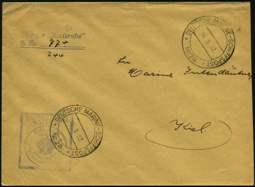 | 988 | 30 € | DEUTSCHE MARINE / DIENSTPOST 1919-1933 : DEUTSCHES REICH 1932 (16.9.) 2K-BPA: DEUTSCHE MARINE-SCHIFFSPOST/Nr.28 = Leichter Kreuzer "Karlsruhe", 2. Auslands- u. Weltreise: Karibik, Mexico, Panama, Hawaii, U.S.A. + 2 viol. HdN: Amts-Kassen/Kreuzer "Karlsruhe".. meist klar gest. Marine-Dienstbf. (rechts gering verkürzt) n. Kiel, das Schiff wurde am 9.4.1940 von brit. U-Boot "Truant" versenkt | | |