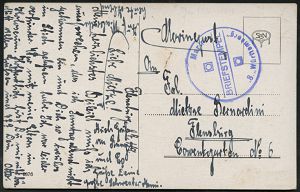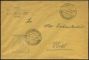 | 972 | 30 € | DEUTSCHE MARINE / DIENSTPOST 1919-1933 : Flensburg 1919 (27.1.) aptierter, viol. 1K-Brücken-Briefstempel: ..Marine/S. "Württemberg", das Wort "Kaiserl." und "SM(S)" entfernt = MSP No.96, altes Panzerschaiff als Torpedo-Schulschiff eingesetzt (nach 1919 abgewrackt) + hs. "Marinepost", Orts-Feldpost-Kitsch-Ak., seltener Beleg! | | |