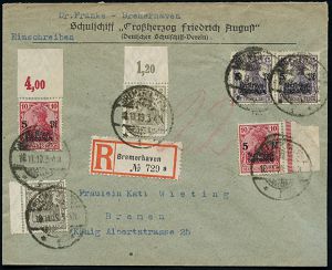 | 971 | 25 € | DEUTSCHE MARINE / DIENSTPOST 1919-1933 : BREMERHAVEN/ *1* 1919 (Juli) 1K-Gitter auf Dienst-Bf.: Schulschiff "Großherzog Friedrich August"/(Dt. Schulschiff-Verein) + gez. RZ: Bremerhaven/a, Germania-Frankatatur, dabei kompl. Satz Kriegsgeschädigte (Mi.105/06), Inl.-R-Bf. (n. Bremen, rs. AS.) | | |