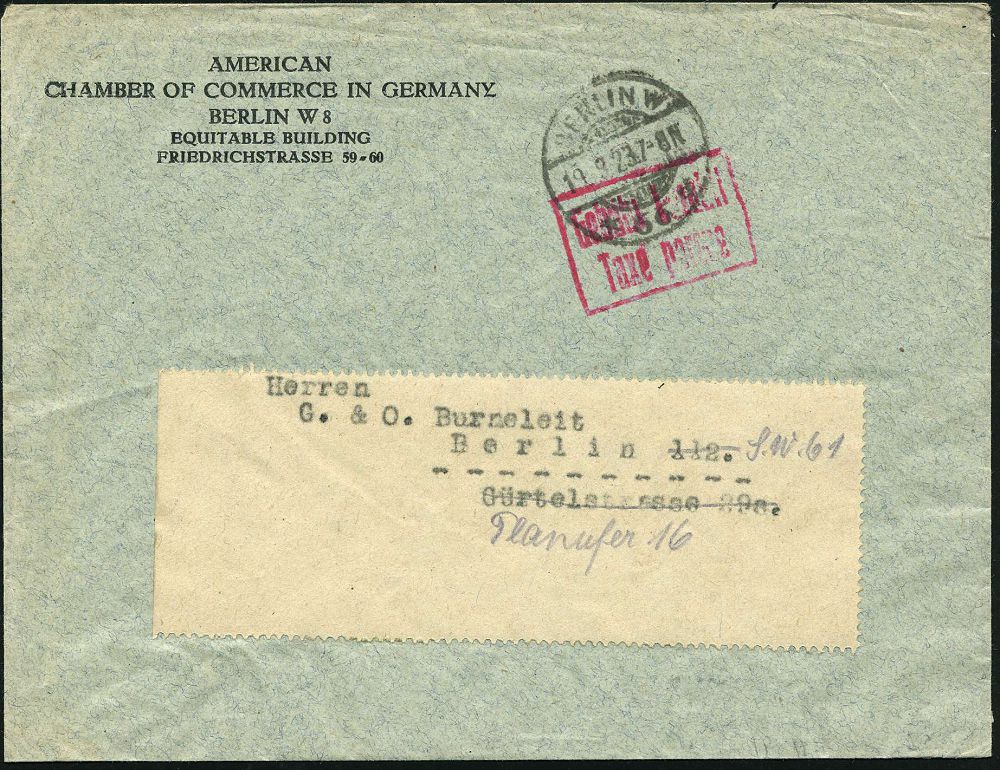 | 1032 | 18 € | WEIMARER REPUBLIK 1919 - 1932/33 : BERLIN W/ *66d 1923 (19.9.) 1K-Gitter + rotvioletter Ra2: Gebühr bezahlt/Taxe percue, Vordr.Bf.. AMERICAN CHAMBER OF COMMERCE GERMANY.. ,rs. gr. US-Staatswappen!, seltener Ortsbf. | | |