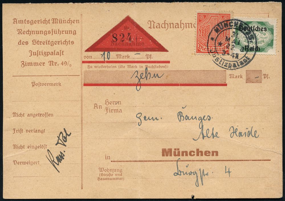 | 1131 | 18 € | WEIMARER REPUBLIK 1919 - 1932/33 : MÜNCHEN 35/ *a/ J u s t i z p a l a s t 1922 (31.5.) 2K = Hauspostamt auf Dienst 1K. + 1 1/4 Mk. Bayern "Abschied" , NN-Orts-Kt.: Amtsgericht.. Rechnungsführung des Streitgerichts, Justizpalast (schwache Falte), klar gest.! (Mi.D 47, D 30) | | |