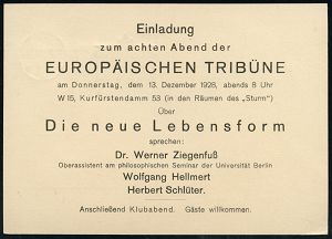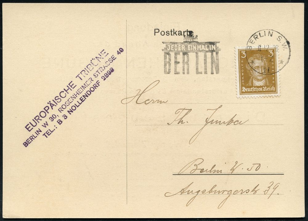 | 1050 | 35 € | WEIMARER REPUBLIK 1919 - 1932/33 : BERLIN S.W./ *11*/ JEDER EINMAL IN/ BERLIN 1928 (11.12.) MWSt = Brandenbg. Tor auf Einladungs-Kt.: EUROPÄISCHE TRIBÜNE , Vortrag "Die neue Lebensform".. in den Räumen des "Sturm".., der "Sturm" war eine Zeitschrift u. Galerie von Herwarth Walden (mit A Döblin bis 1933) seltener Beleg! (Bo.100 A X) | | |