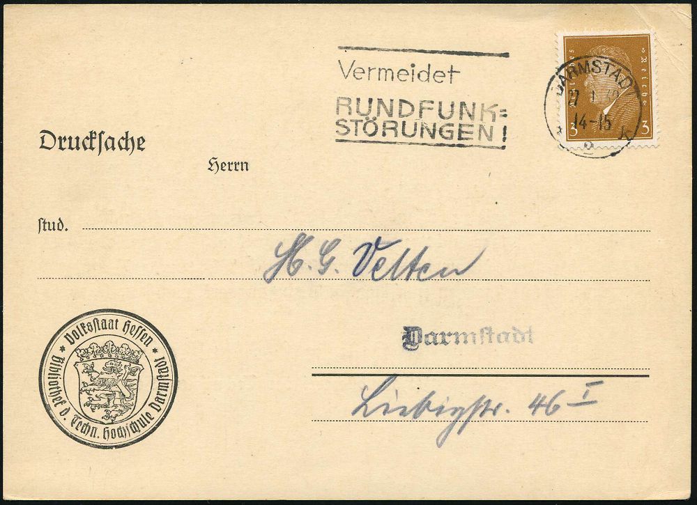 | 1070 | 18 € | WEIMARER REPUBLIK 1919 - 1932/33 : DARMSTADT/ *2k/ Vermeidet/ RUNDFUNK=/ STÖRUNGEN 1932 (27.1.) MWSt auf Dienst-Vordr.Kt.: V o l k s s t a a t Hessen/ Bibliothek der Techn.Hochschule (Wappen) seltene Orts-Drs.-Kt. (Bo.S 126 A) | | |