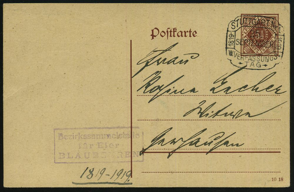 | 1138 | 18 € | WEIMARER REPUBLIK 1919 - 1932/33 : STUTTGART Nr.1/ 1819-/ 1919/ W.VERFASSUNGS-/ TAG 1919 (25.9.) SSt + viol. Ra.: Bezirkssammelstelle/für Eier.. , klar gest. P 5 1/2 Pf. Württembg. (rs. Text annulliert) Bedarf (Bo.6 I = Postam Nr. 1) | | |