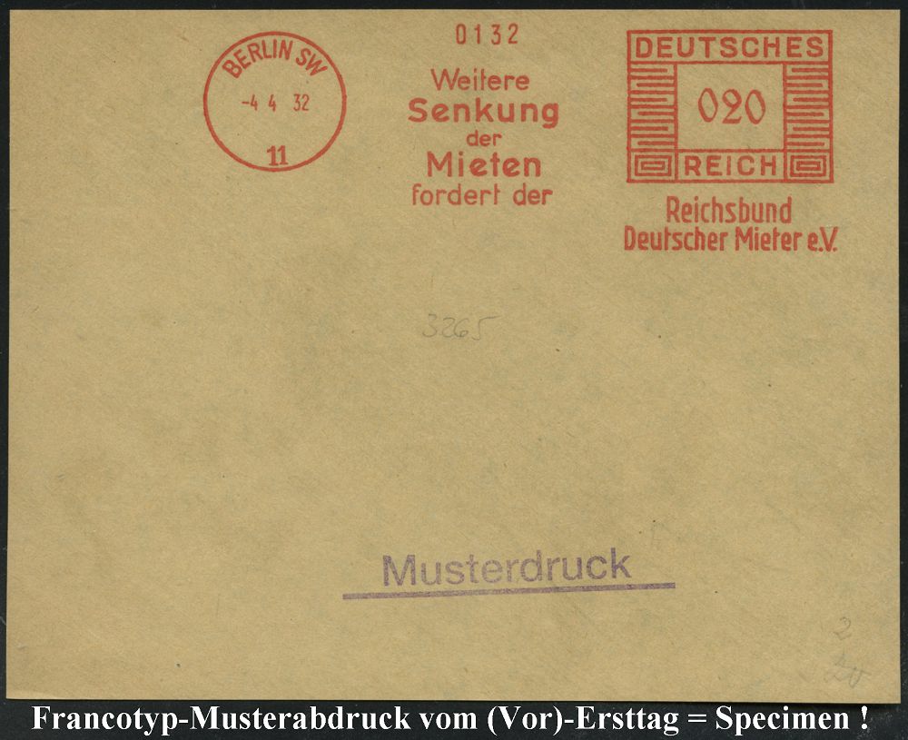 | 1064 | 25 € | WEIMARER REPUBLIK 1919 - 1932/33 : BERLIN SW/ 11/ Weitere/ Senkung/ d./ Mieten/ fordert d./ Reichsbund/ Deutscher Mieter eV. 1932 (4.4.) AFS-Musterabdruck Francotyp "Mäanderrechteck" , glasklar gest. Francotyp-Musterblatt vom (Vor)-Ersttag !, selten! (Dü.E-2CEh) | | |