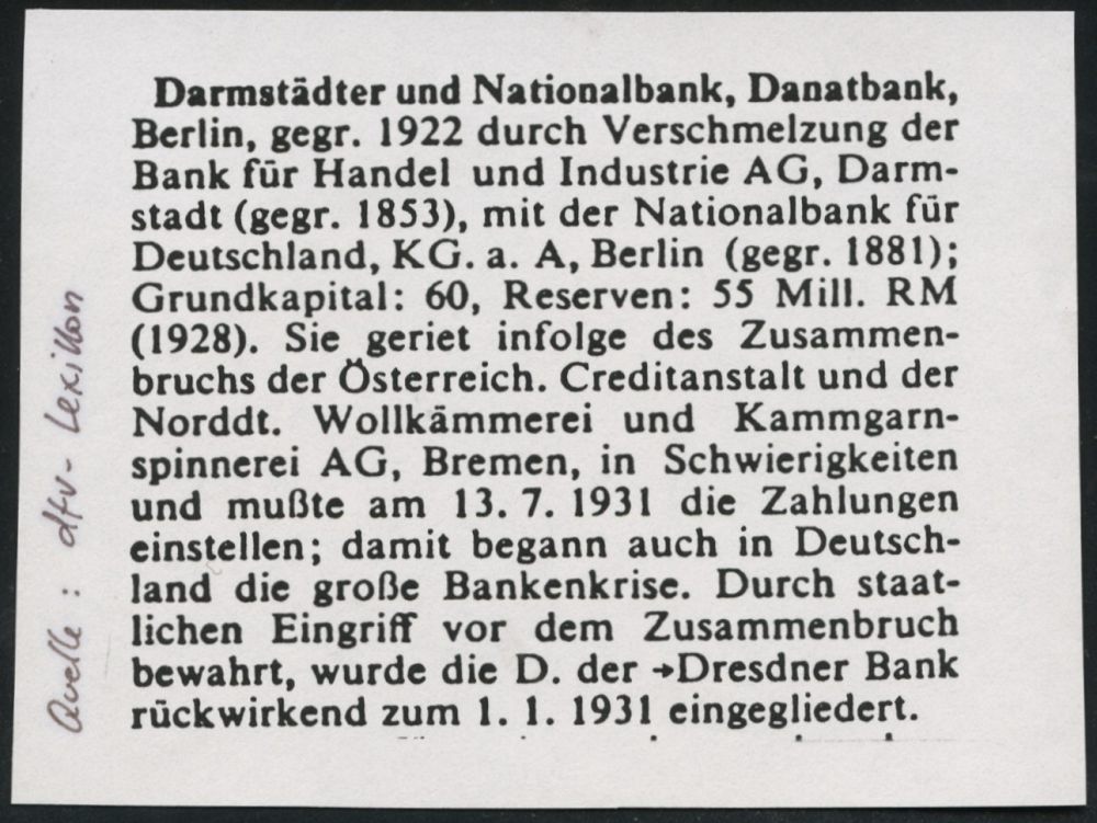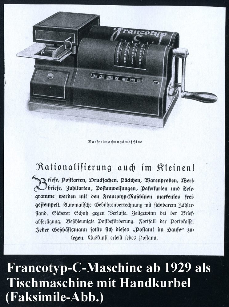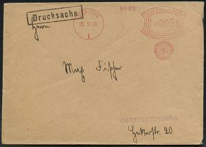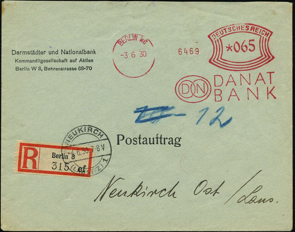 | 1055 | 25 € | WEIMARER REPUBLIK 1919 - 1932/33 : BERLIN W8/ D N/ DANAT/ BANK 1930 (3.6.) AFS Francotyp "Bogenrechteck" 065 Pf. + Firmen-RZ: Berlin 8/e f , Die Bank wurde nach der Weltwirtschaftskrise 1931 zahlungsunfähig, ab 1.1.1931 rückwirkend Dresdner Bank, Fern-Postauftrags-R-Bf., seltenes Porto! (Dü.E-1Am) | | |
