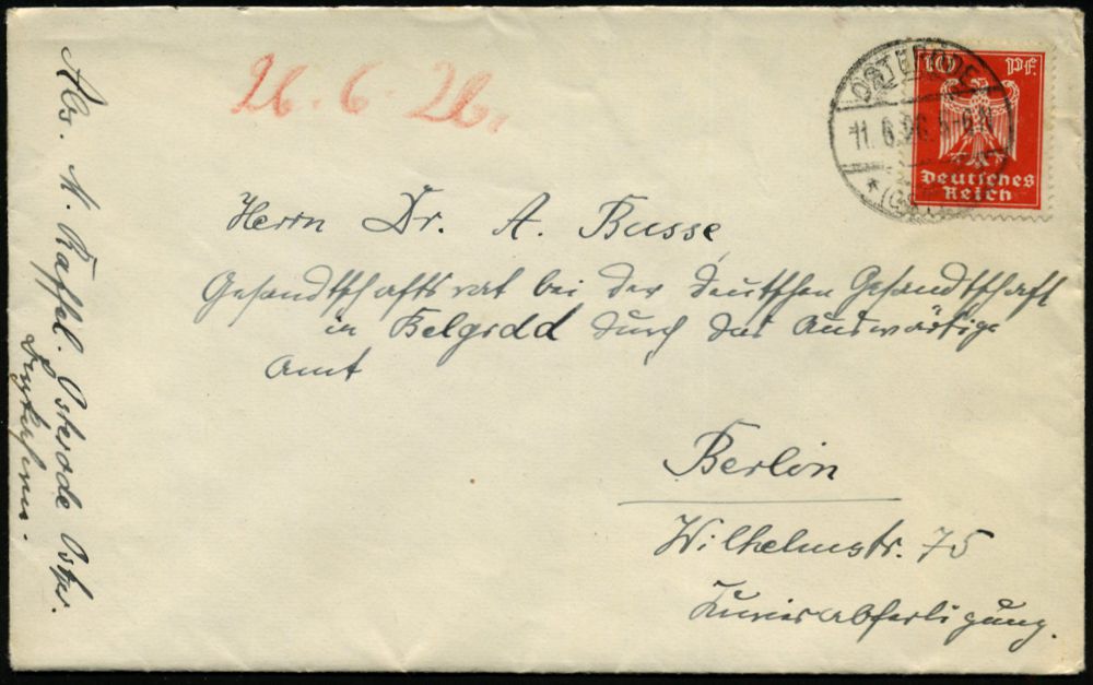 | 1135 | 20 € | WEIMARER REPUBLIK 1919 - 1932/33 : OSTERODE/ *(OSTPR.)/ i 1926 (11.6.) 1K-Brücke auf EF 10 Pf. Adler = Inlands-Tarif , diplomatischer Kurier-Dienstbf. an Gesandtschaft Belgrad (ab Berlin) + Inhalt!, hs. Vermerk: "..durch das Auswärtige Amt Berlin..", 2 seltene Belege kompl. (Mi.357 EF) | | |