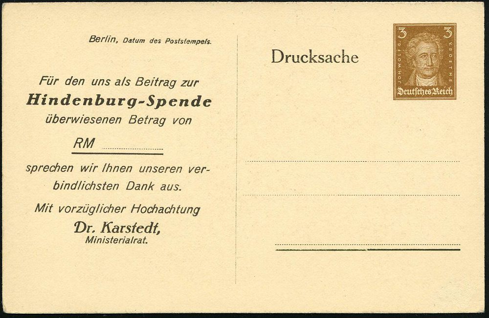 | 1156 | 18 € | WEIMARER REPUBLIK 1919 - 1932/33 : DEUTSCHES REICH 1927 (15.7.) PP 3 Pf. Goethe, braun: 2. Oktober Hindenburgspende (Brustbild, Zitat) ungebr. (Mi.PP 97/C 3) | | |