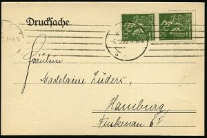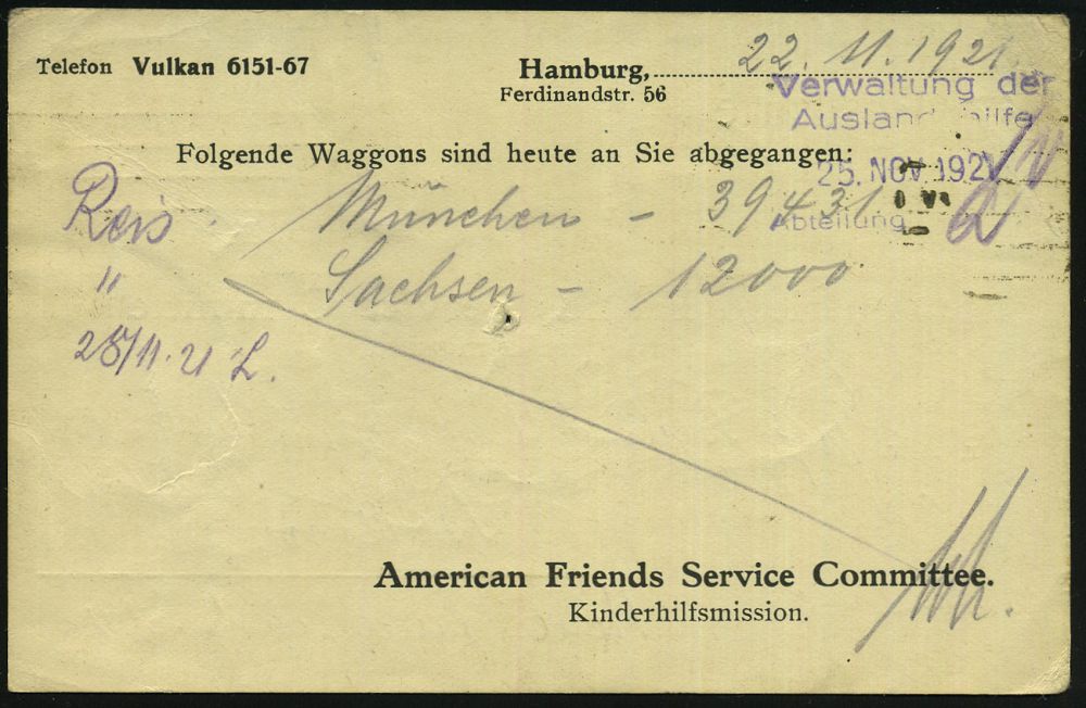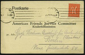 | 1093 | 30 € | WEIMARER REPUBLIK 1919 - 1932/33 : Hamburg 1921 (Nov.) seltene Vordruck-Kt.: "American Friends Service Committee, Kinderhilfsmission" = US-Kinderhilfs-Organisation in Europa nach dem. I. Weltkrieg, EF 40 Pf. Ziffer, rs. Text: Ankündigung v. Güterwaggons an "Ausschuß für Auslandshilfe Berlin", = UNICEF-Vorläufer!, Friedens-Nobelpreis 1947 ! (Mi.163) | | |